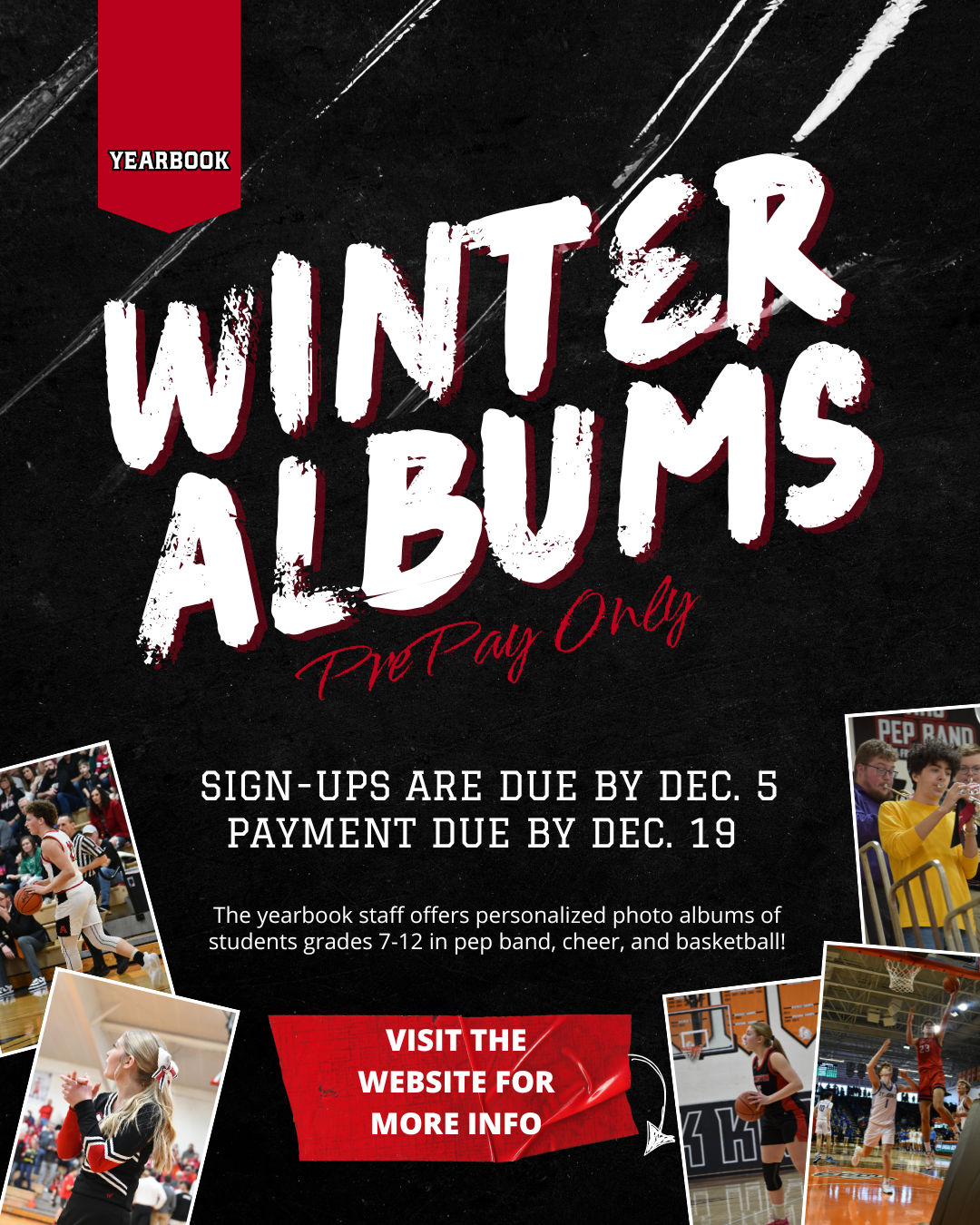 The Yearbook team is offering albums for basketball, cheerleading, and pep band. Fill out the Album Order Form. If you have multiple children and/or sports seasons, fill out a new form for EACH. Orders must be placed by Friday, December 5.