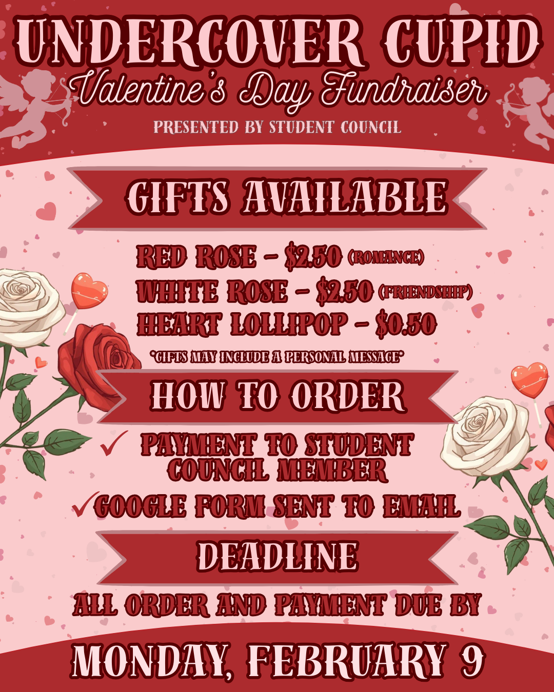 Send a rose or candy heart sucker to your friend, crush, or significant other! Roses are $2.50/each and suckers $.50/each. Gifts can be anonymous and/or include a note. Gifts will be delivered during lunch on Friday, February 13.