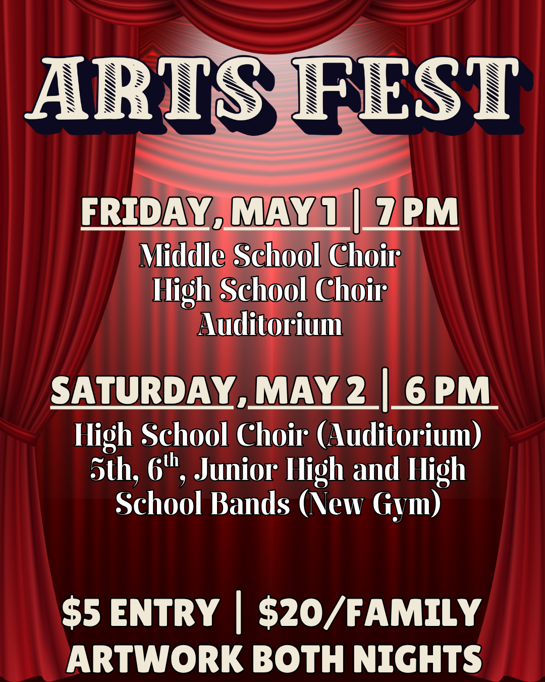 On Saturday, the High School Choir will perform for a SECOND time, and the 5-12th-grade bands will perform in the NEW GYM following the choir's performance at 6PM.